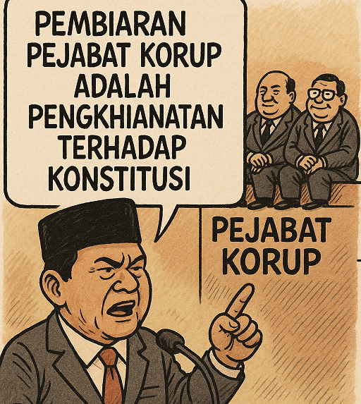 Namun hari ini, rakyat menyaksikan dengan getir bahwa sejumlah pejabat yang memiliki rekam jejak kuat dalam kasus dugaan korupsi tetap dibiarkan menduduki posisi strategis dalam kabinet pemerintahan terpilih, tanpa tindakan tegas dari aparat penegak hukum—baik KPK, kepolisian, maupun kejaksaan. Di sinilah masalah fundamentalnya: pembiaran oleh Presiden terhadap lingkaran kekuasaan yang terkontaminasi adalah bentuk pengkhianatan terhadap konstitusi.