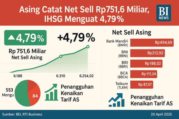 Jakarta, 30 Juni 2025 — Meskipun Indeks Harga Saham Gabungan (IHSG) mencatat kenaikan signifikan sebesar 286,03 poin atau 4,79% ke level 6.254,02 pada perdagangan Kamis (20/6), investor asing justru melakukan aksi jual bersih (net sell) senilai Rp 751,6 miliar.